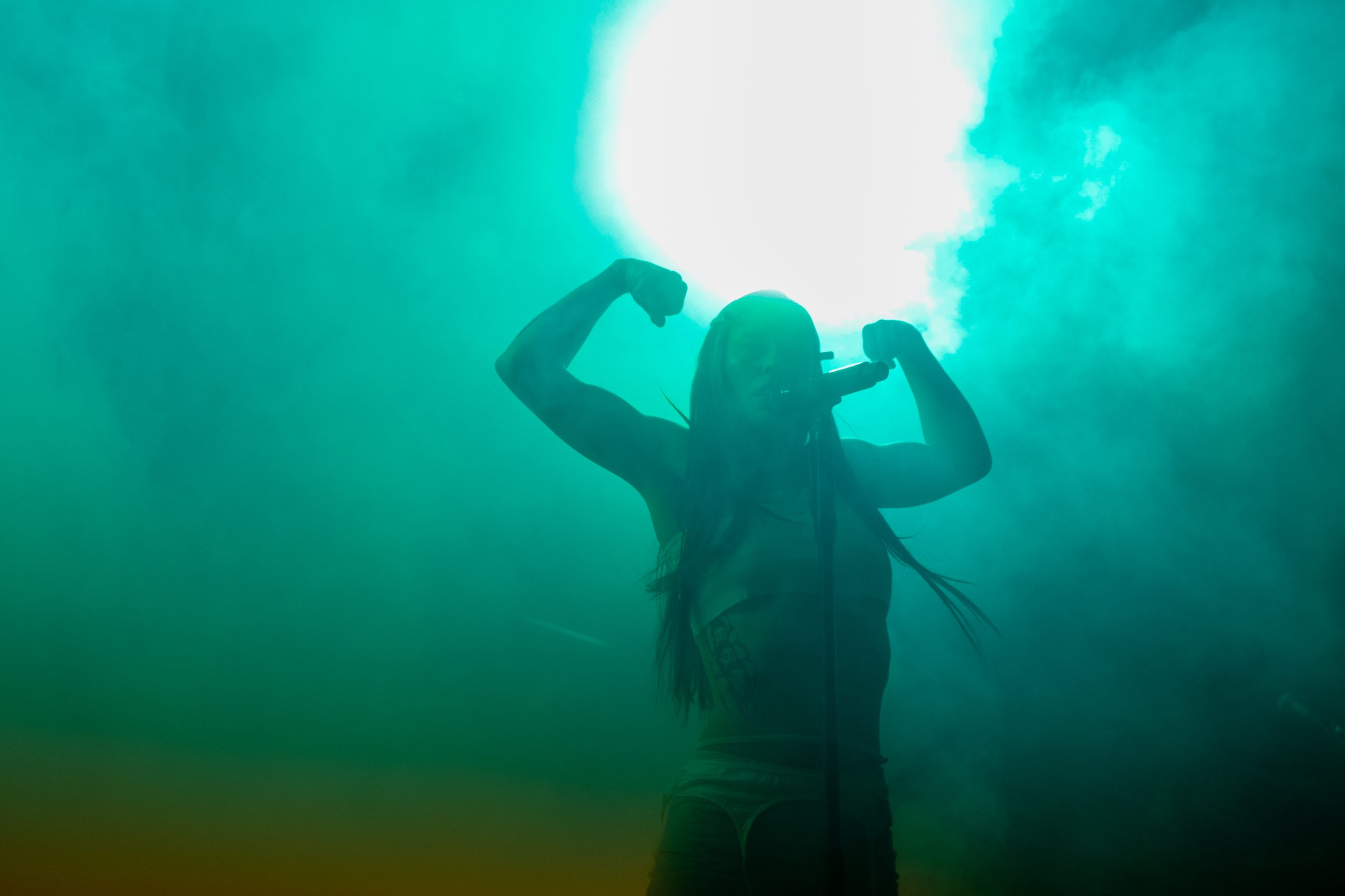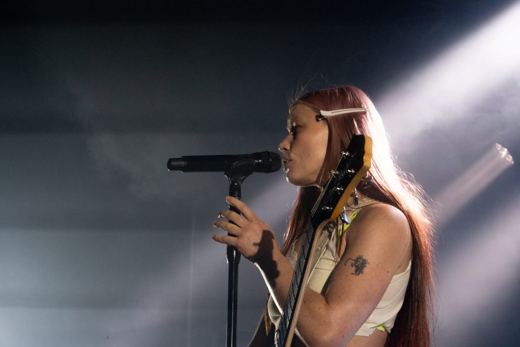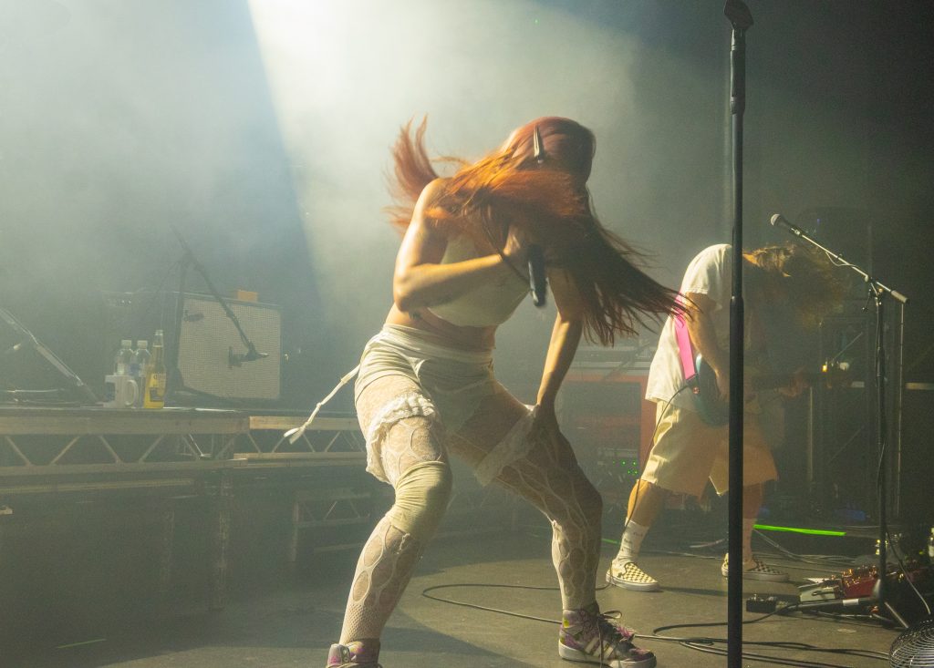 The stage is dimly lit and smoky. Very very smoky. The band enter the stage, but mostly hidden by the smoke. Then we see Rhian Teasdale dressed in white. She walks to the front of the stage, through the smoke to the mic stand and strikes the ‘muscle pose’. The crowd love it and loudly cheer as Rhian gets straight into ‘catch these fists’. A song described by Rhian as a “late-night rebuke to pickup artists”. The stage is still very dark and smoky with insanely bright strobing lights. We see Rhian stalk the stage as she shouts the yeah yeah yeah refrain.