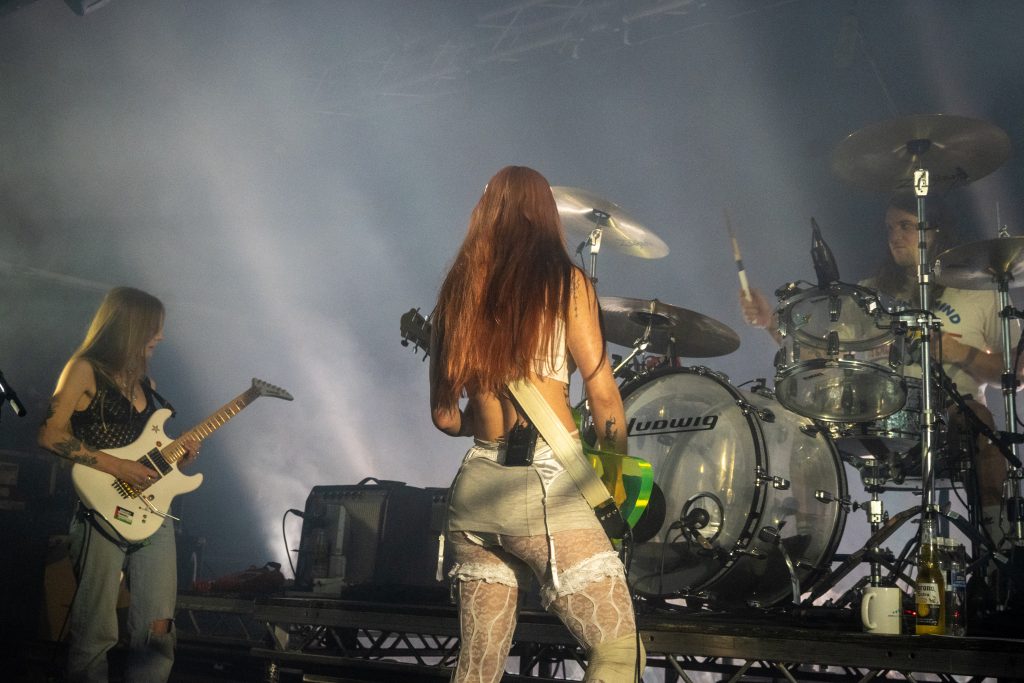 Hester Chambers, by comparison to Rhian is shy, quietly stood to the side of the stage. The complete opposite of Rhian. At the front of stage, there’s Ellis Durand on bass and Josh Mobaraki on guitar perfectly flanking Teasdale. Completing the lineup is Henry Holmes on drums. Wet Leg started as a duo, but now a five piece, after adding the 3 touring musicians to the band.